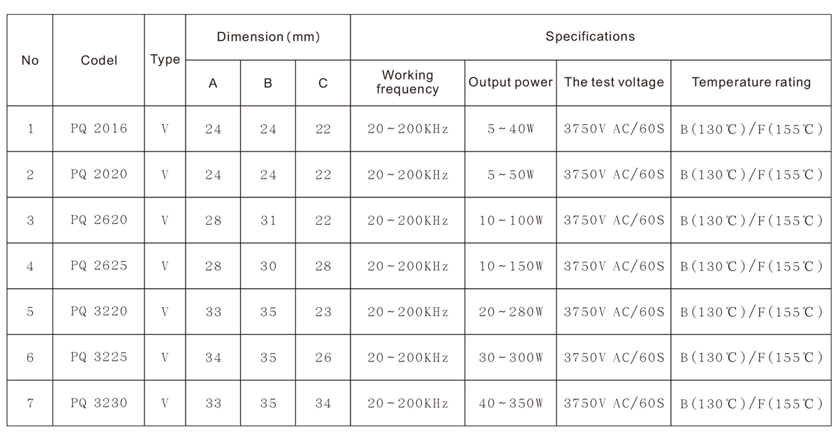 PQ型高頻變壓器的磁芯是為了適應(yīng)新型開關(guān)電源的使用要求而設(shè)計的鐵氧體磁芯,它的形狀能滿足工作在高頻下的開關(guān)電源變壓器減少銅損和鐵損的要求,同樣也能適應(yīng)開關(guān)電源在溫升方面的要求。它的圓形中心柱使繞線更為容易,線包容量加大,骨架的引線端使產(chǎn)品安裝十分可靠。PQ型變壓器常用型號有PQ2020,Pq2620,PQ3220,PQ3230,PQ3535,PQ4040,PQ5050等。